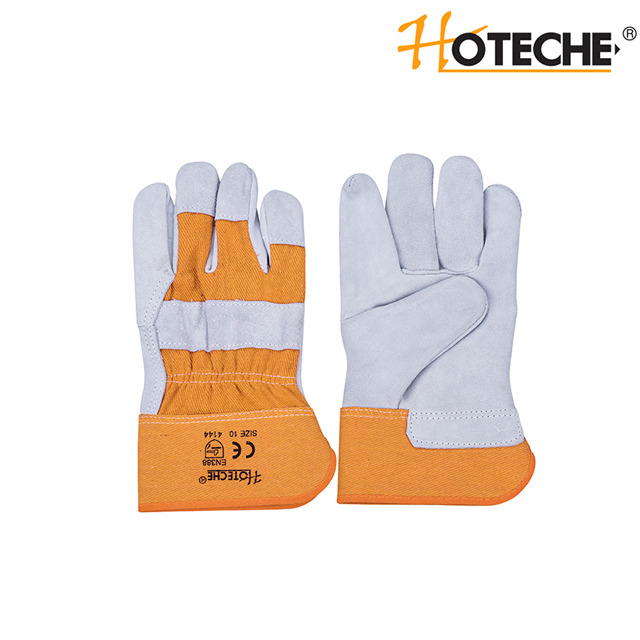 - Cuero partido de vaca- Puño de seguridad de goma- Tejido a rayas para la espalda.- Embalaje: tarjeta de suspensión
